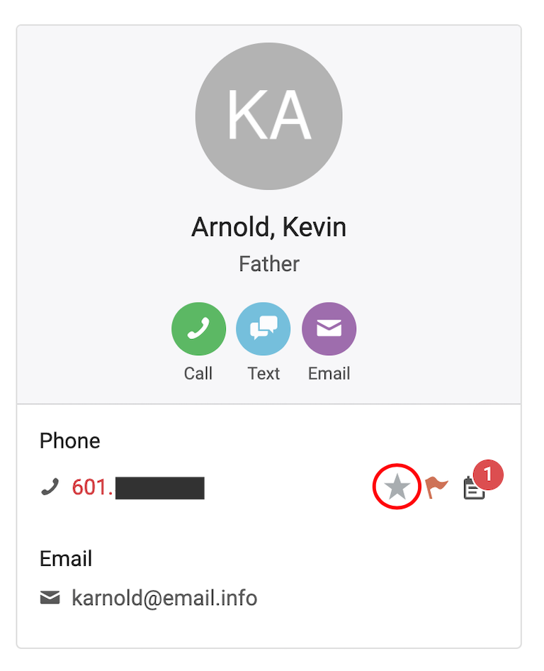 Then, click on the Star to set a contact as preferred. You can have as many preferred contacts as you'd like on a student's contact list, but remember, a Broadcast cannot be sent without setting preferred contacts first.