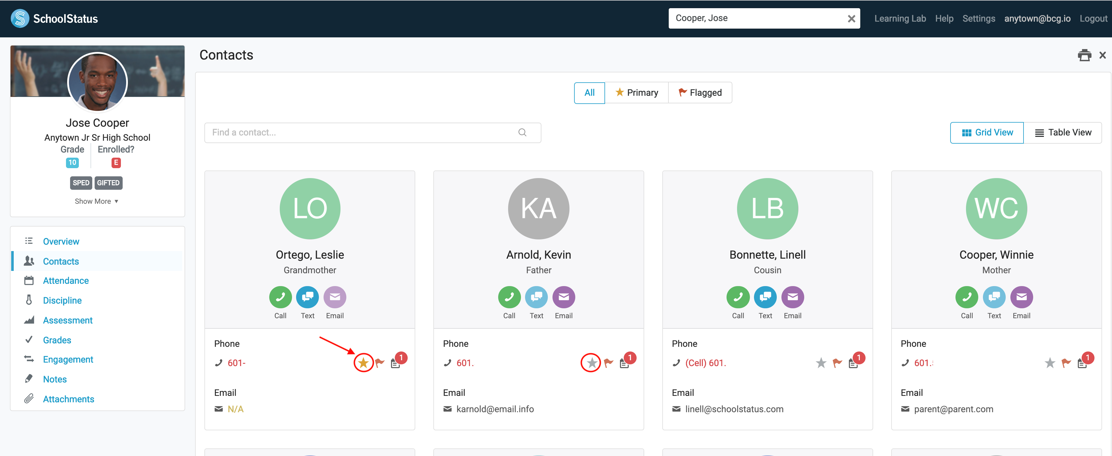 Each student must have at least one Preferred Contact marked with the star on the Student Card Contacts page in order to receive a Broadcast or Notify message. In some cases, we can import settings from your SIS, but when we can't, we rely on SchoolStatus users to select them. You can do this by utilizing our Preferred Contacts Management Tool or by marking preferred contacts for individual students by following the instructions below.