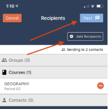 The next panel is a review of your audience. Notice that it will always say "Sending to 19 contacts", or however many parents have been starred for your students. This number will usually be 1-2 times higher than your student count. You can add more people by going to the previous screen and following the instructions below. If you are ready, tap Next to begin typing your message.