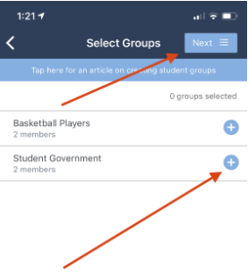 Use the + to choose the group/s you want to send a message to and then tap Next.